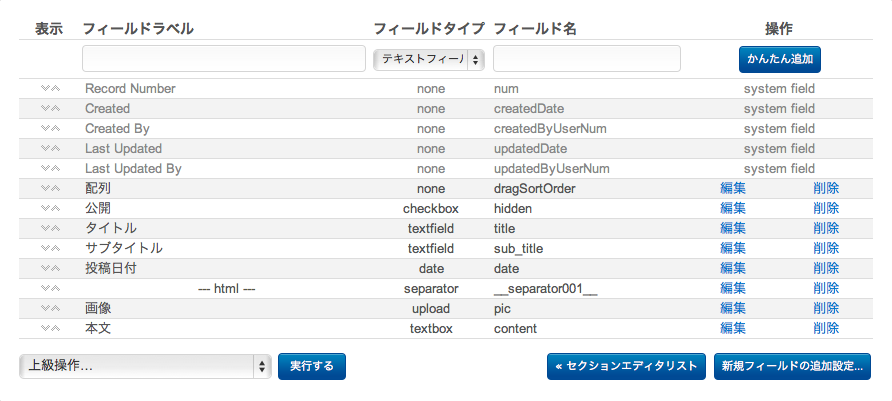 セクションエディタで、表示順を